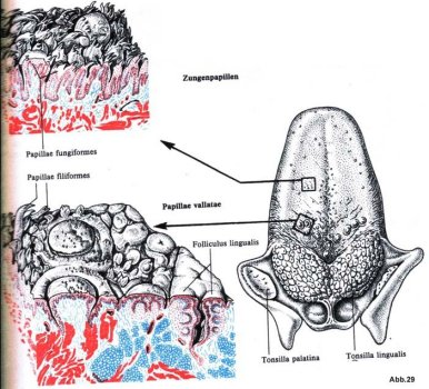 lokalisiert sind. Man findet aber auch ein paar Papillen an Teilen des Gaumens