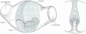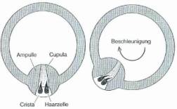 damit auf die Cupula, die sich ausbeult und die Haarbündel abbiegt.